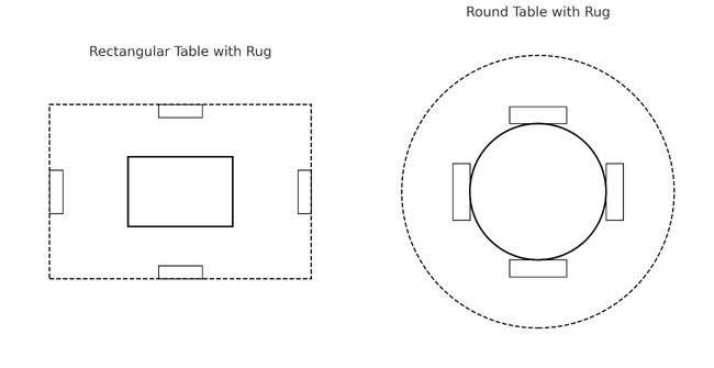 A common mistake is using a rug that just barely fits under the table and chairs. If any chair legs fall off the rug when pulled out, the size of the rug is too small.