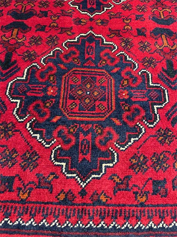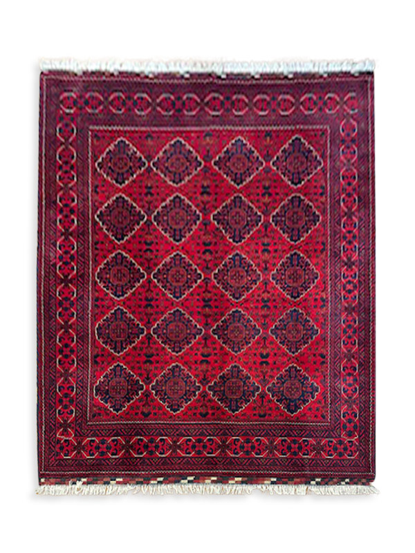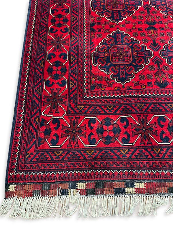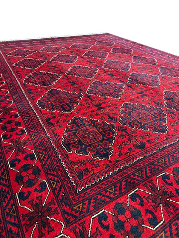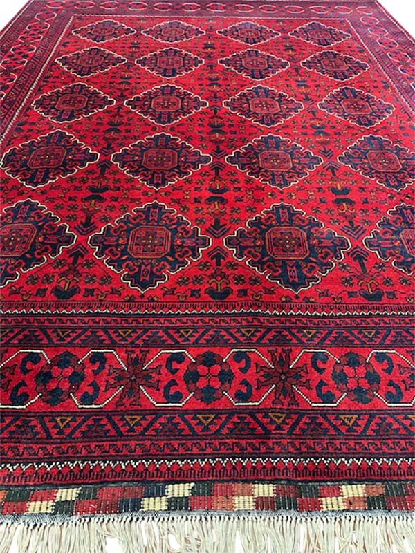 Hand knotted pure wool Afghan Kamyab rug , overall geometric design with the warmth of the rich colour combination which continues to the fringes , this beautiful rug will transform your space from dull to beautiful.