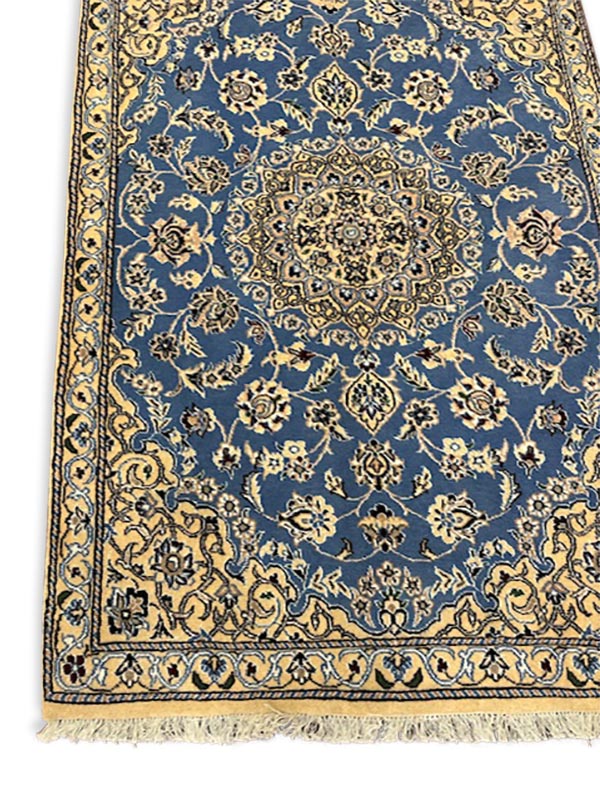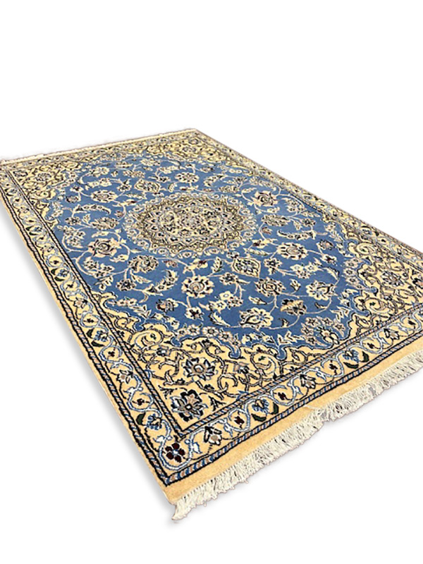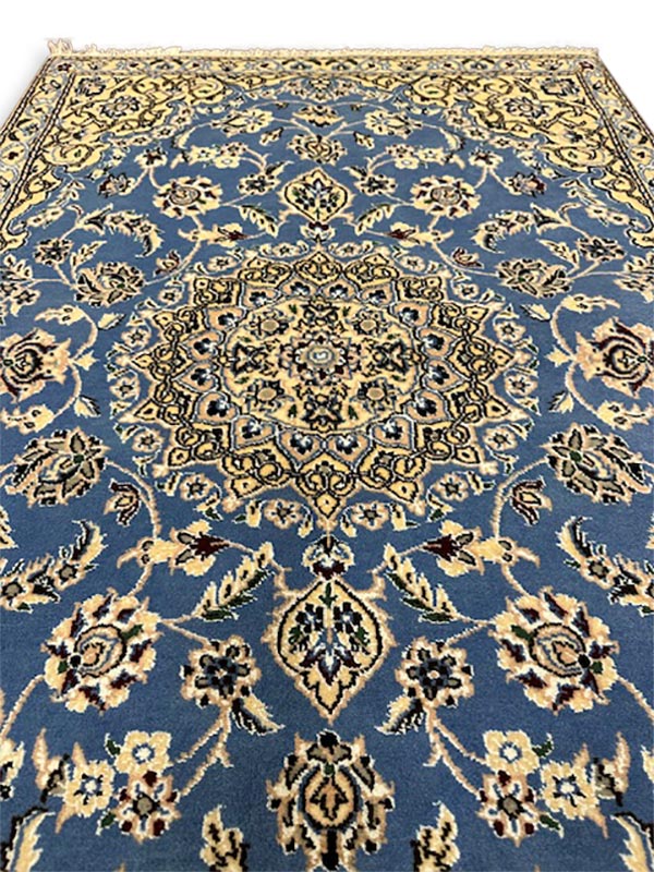 Hand knotted wool and silk in laid Persian Nain rug , amazing light blue centre medallion design makes the silk pop and show case the amazing workmanship.