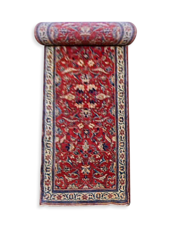 Hand knotted semi antique Persian Sarouk rug , overall design in warm red tones which are subtle in appearance making it easy to decorate with while adding a touch class with this amazing hall rug.